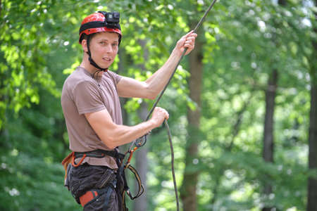 Arborist wearing safety harness and helmet, using ropes and carabiners for tree pruning
