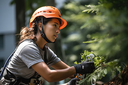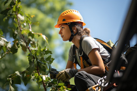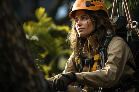 Woman logger wearing forestry helmet, looking up with focus and determination