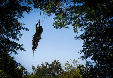Tree worker hanging on a rope as he climbs trees