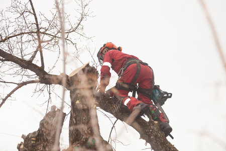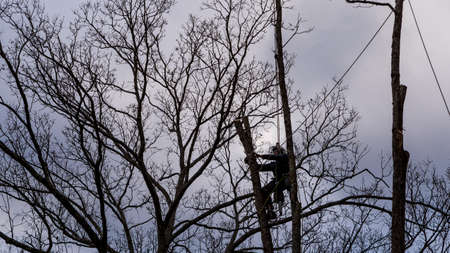 cutting professional, arborist in pruning, cutting back, removing leafless bare mature tree branches safely. tree surgeon working using chainsaw, hanging on multiple ropes, equipment. autumn cloudy