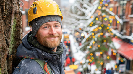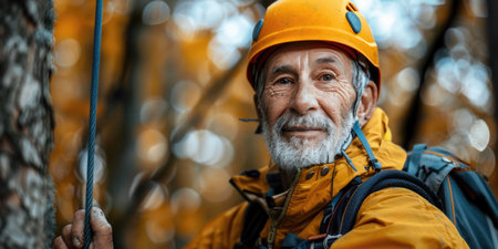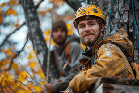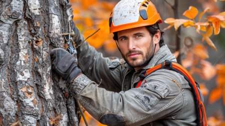 A man wearing a yellow helmet and jacket observes a tree surrounded by vibrant autumn leaves. His expression shows focus and determination.