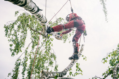Arborist cuts branches on a tree with a chainsaw, secured with safety ropes.