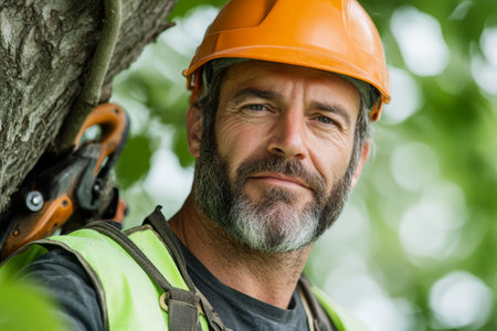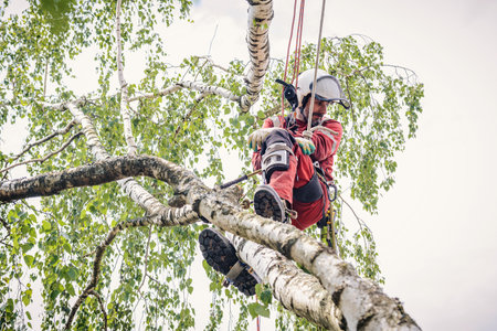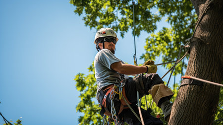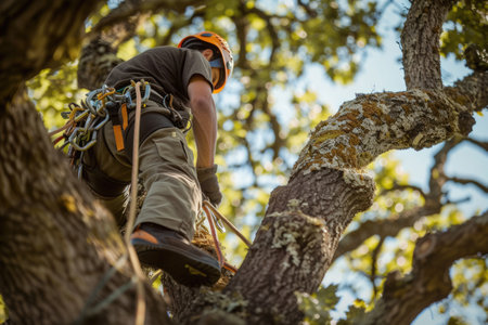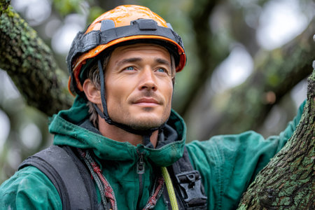 Arborist man focused on task, wearing safety helmet and climbing gear in a tree