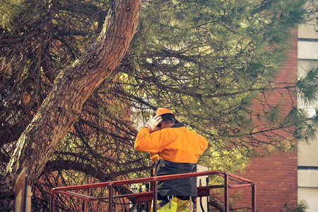 Worker maintain urban tree health by pruning branches in city parks.