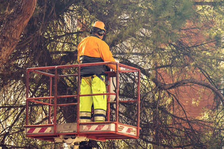 gardener worker on crane, professional man is ready to trim some tree branches in the city park