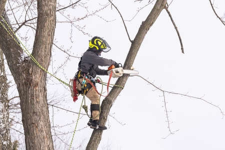 Quebec, Canada - 06-02-2025: Tree trimmer cutting the branches of a tree with a chainsaw. Lumberjack with chainsaw cutting branches.