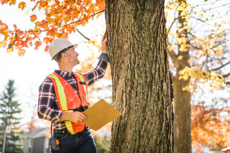 Professional arborist working outdoors, examining tree bark and branches
