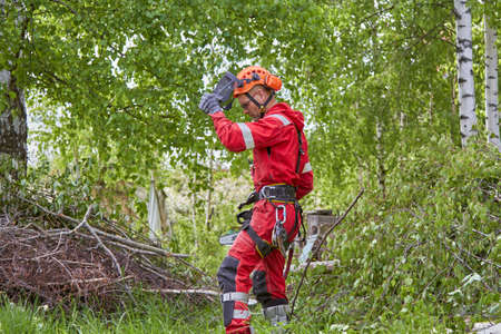 tree surgeon. A forester chopping down a tree with a chainsaw
