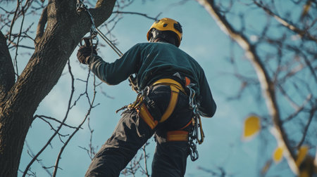 graceful arborist, skillfully ascending a rope to prune and cut for big trees in action expertise in tree maintenance.Generated with AI