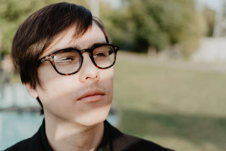 outdoor portrait of a young man with closed eyes