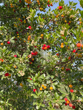 Fruiting Strawberry tree in a garden in Mandello del Lario Italy