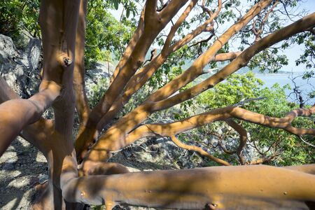 Trunk of arbutus tree with its peeling pink bark. Arbutus strawberry tree with no bark