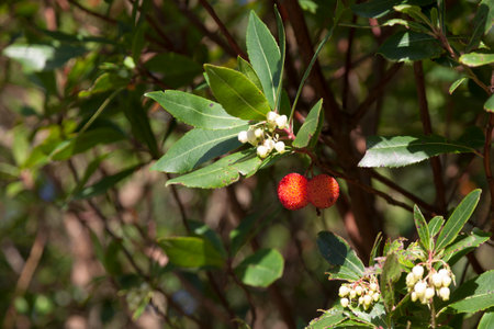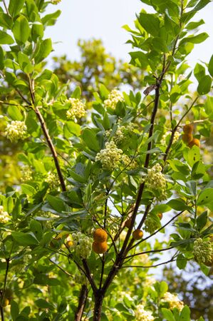 Arbutus or strawberry tree flower, leaves and fruit. Selective focus. Horizontal photography. Copy space.