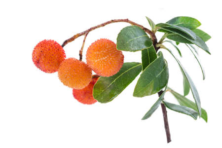 Arbutus branch and very ripe orange fruit on a white background