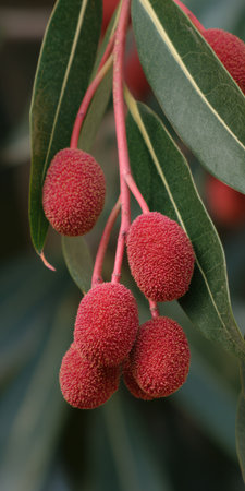 closeup in vertical view of the fruits of the strawberry tree. The fruits of the strawberry tree are used in the preparation of jams, fruit sorbets such as mango and some alcoholic beverages.