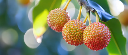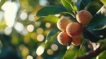A stunning display of ripe lychee fruits hanging from a branch, illuminated by sunlight filtering through lush green leaves, creating a vibrant and refreshing scene.