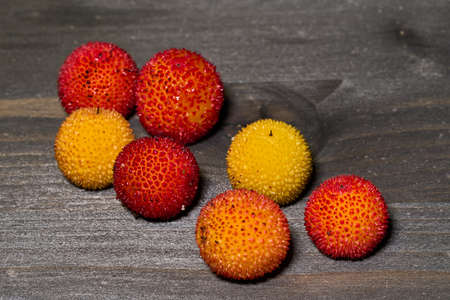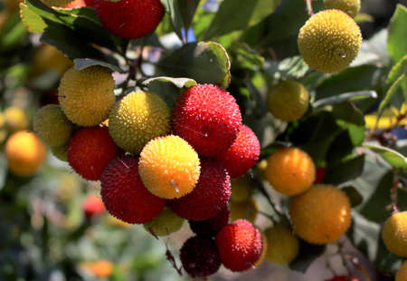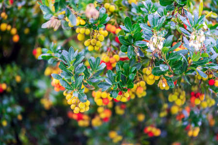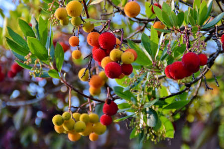 Ripe red and yellow fruits of the Arbutus unedo tree at the end of autumn