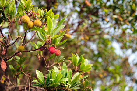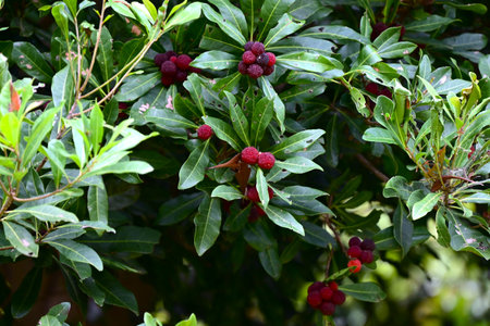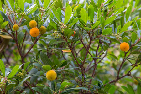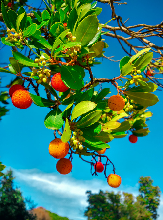 Arbutus unedo tree with fruits and leaves in the garden