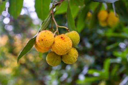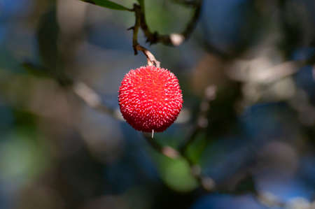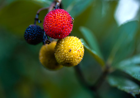 Ripe fruits of the strawberry tree (Arbutus unedo) with selective focus