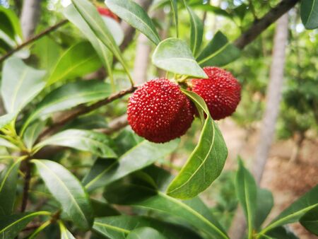 Red bayberry (Morella rubra) berries. Myricaceae dioecious evergreen tree. The berries ripen in summer and are used to eat raw or to make jams and fruit wines.