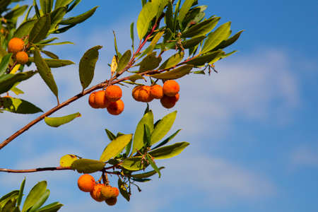 Close up of strawberry tree fruits on a branch against a blue sky
