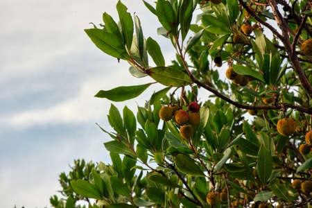 Detail of the branches of an arbutus tree with its fruits.