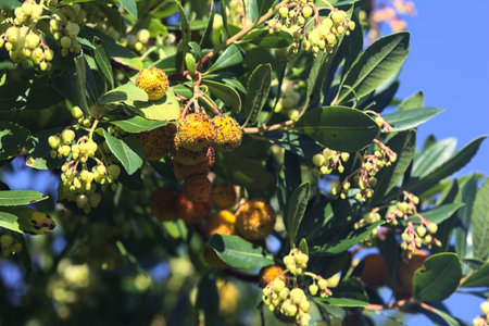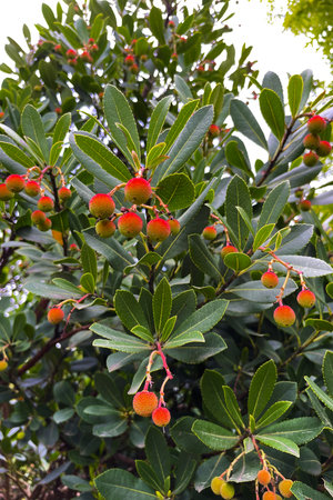 Strawberry tree (Arbutus unedo) in a park in Madrid, Spain. The strawberry tree is one of the symbols of Madrid, it is part of the city coat of arms