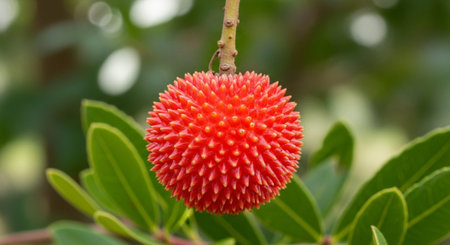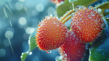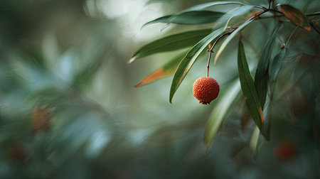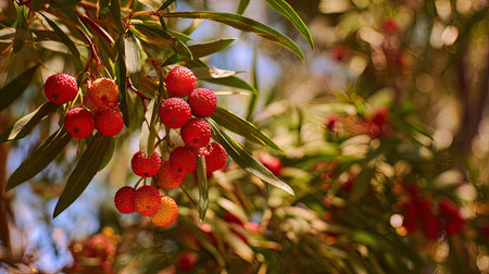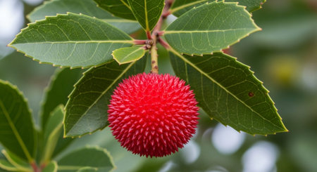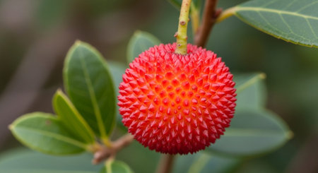 Red arbutus unedo fruits ripen on a strawberry tree branch, textured and vibrant against green leaves, showcasing seasonal color and fresh botanical detail in close-up