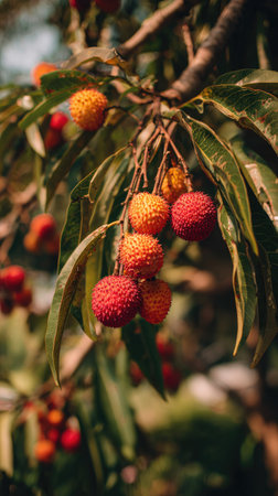 Clusters of lychee fruit hang from a lush green tree showcasing vibrant colors as they ripen under soft sunlight in a tropical setting.