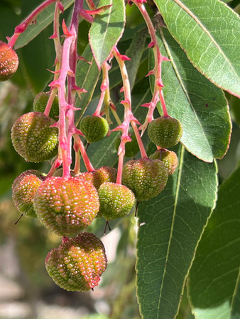 Strawberry Tree, Arbutus unedo with strawberry like dry fruits in hanging bunches, rough on surface