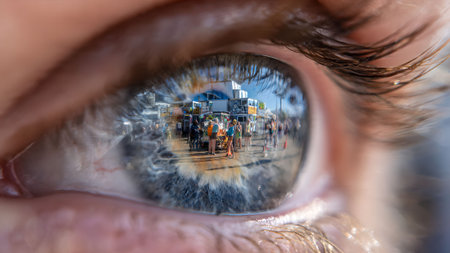 Close-up of an eye reflecting a lively outdoor event with food trucks and people, creating a unique perspective.