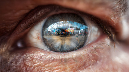 Close-up of an eye reflecting a busy outdoor market scene, showcasing detail and depth of field.