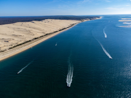 Aerial view of Dune of Pilat tallest sand dune in Europe located in La Teste-de-Buch in Arcachon Bay area, France southwest of Bordeaux along France's Atlantic coastline in sunny day