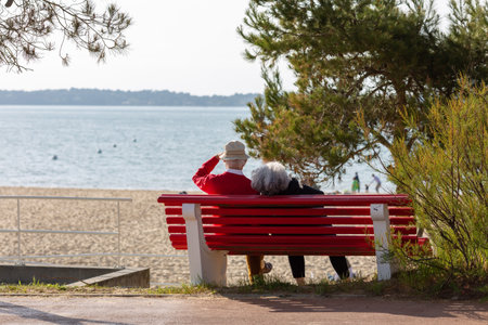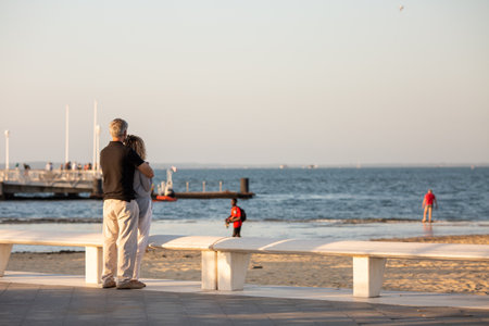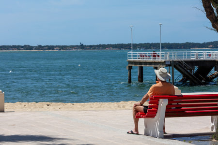 Walking on beach promenade in sunny Arcachon, vacation destination town on Atlantic coast with beautiful parks, villas, streets and sandy beach and pine trees, France
