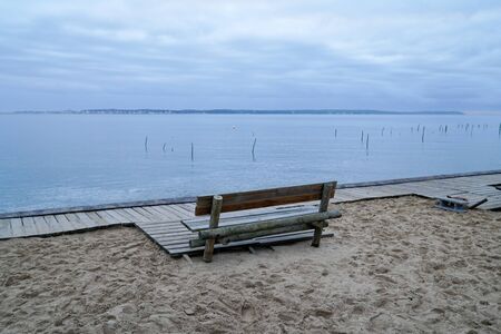wooden winter bench view over Arcachon Bay basin in France near Cap Ferret with Dune du Pilat Pyla background in sunrise