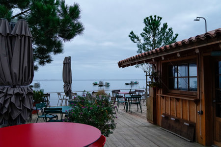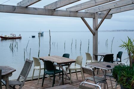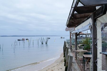 terrace at seaside chairs and wood table on beach village of Le Canon in Cap Ferret France