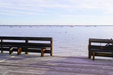Cap Ferret, Arcachon Bay, France. Public bench and jetty
