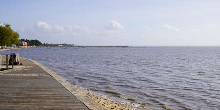 wooden access beach over the bay in Andernos city in Arcachon Bassin south West in France