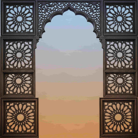 Arabic columns at sunset. 3D rendering. Computer digital drawing.