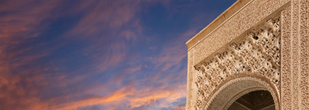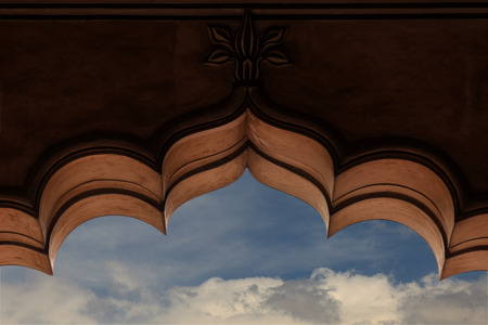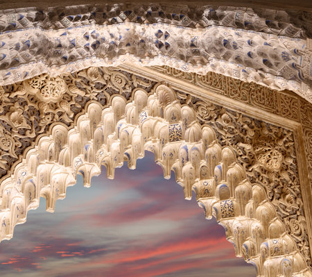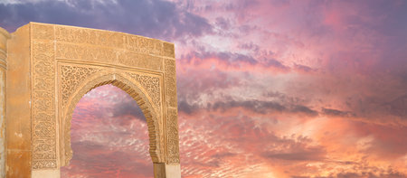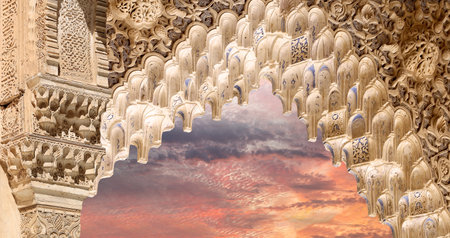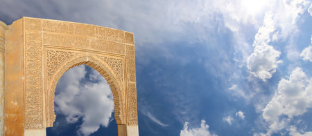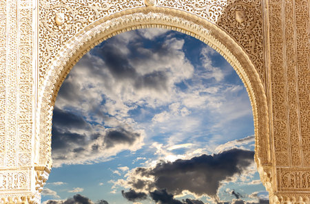 Arches in Islam (Moorish) style (against the background of a beautiful sky with clouds) in Alhambra, Granada, Spain