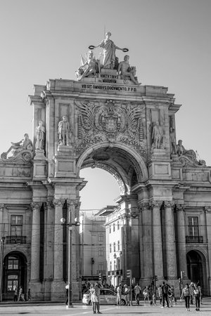 Lisbon, Portugal - May 14: The Rua Augusta Arch in Lisbon on May 14, 2014. Here are the sculptures made of Celestin Anatole Calmels and Victor Bastos. Portugal, Europe.