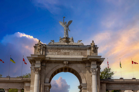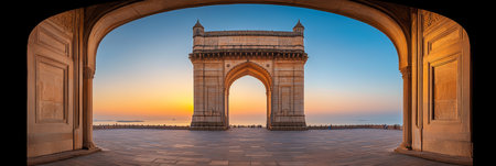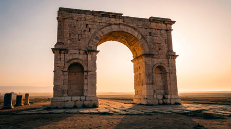 An ancient stone archway stands tall against a golden sunset. This historical site reflects the beauty of architecture and offers a peaceful atmosphere as day turns to night.