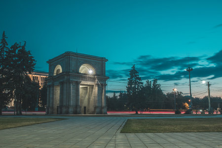 The Triumphal Arch in front of the Government building in Chisinau, Moldova on a warm summer evening at a blue hour. Frog view photo