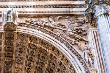 Stone Angel Septimius Severus Arch Roman Forum Rome Italy. Stone arch was erected in 203 AD in honor of Emperor Septimius Severus, who reigned from 193-211 AD. Panels celebrate Severus' victories in Parthia and Arabia.