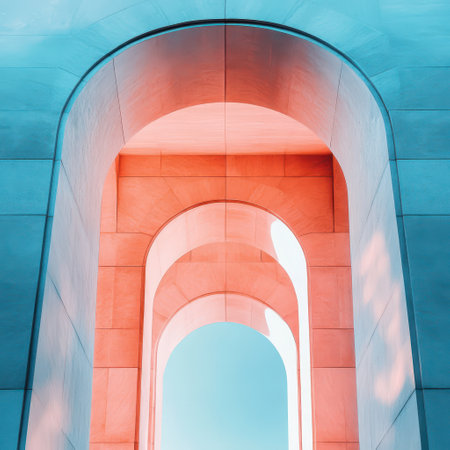 Colorful arches intersect with blue sky creating a stunning display of light and shadow in an urban setting highlighting architectural beauty.