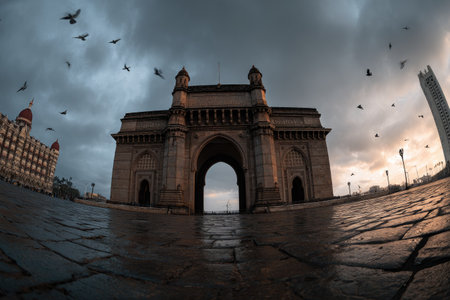 An imposing archway stands centered against a moody, overcast sky. Birds are captured mid-flight, enhancing the dynamic composition. The scene showcases a combination of architectural and natural elements, possibly suitable for editorial publications. The lighting suggests a sunset or sunrise, highlighting textures and structures.