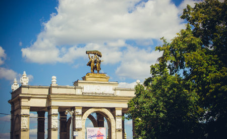 Moscow, Russia - March 20, 2021: Gate arch of the main entrance to VDNH. Built by 1954
