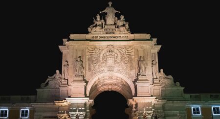Lisbon, Portugal - November 27, 2018: architecture detail of the triumphal arch of the commercial square (Praçca do Comercio) at night on an autumn day