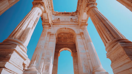 Captured from below, this image showcases towering ancient columns against a bright blue sky, highlighting the intricate details of Roman architecture.