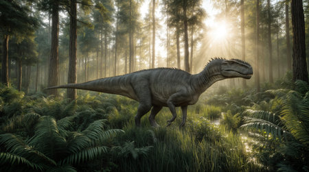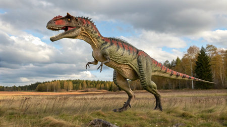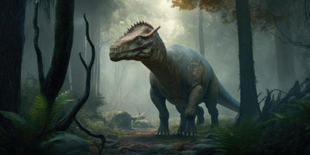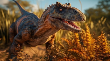 Allosaurus in a whimsical and colorful style. In natural habitat. Jurassic Park